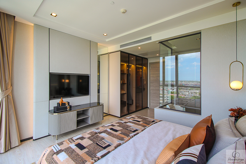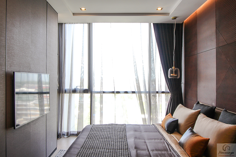 ในห้องนอนมีหน้าต่างบานใหญ่แบบ Full Height หรือกระจกบานสูงจรดเพดานมาให้ มองออกไปเห็นวิวเมืองกว้าง ๆ สบายตามาก ๆ