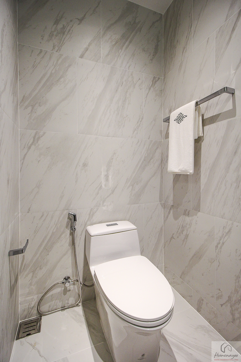 เข้ามาด้านในจะแบ่งส่วนแห้ง แยกส่วนเปียกให้เรียบร้อยค่ะ พื้นและผนังตกแต่งกระเบื้อง Porcelain ลายหินอ่อนมาให้เหมือนกันกับห้องน้ำด้านนอก