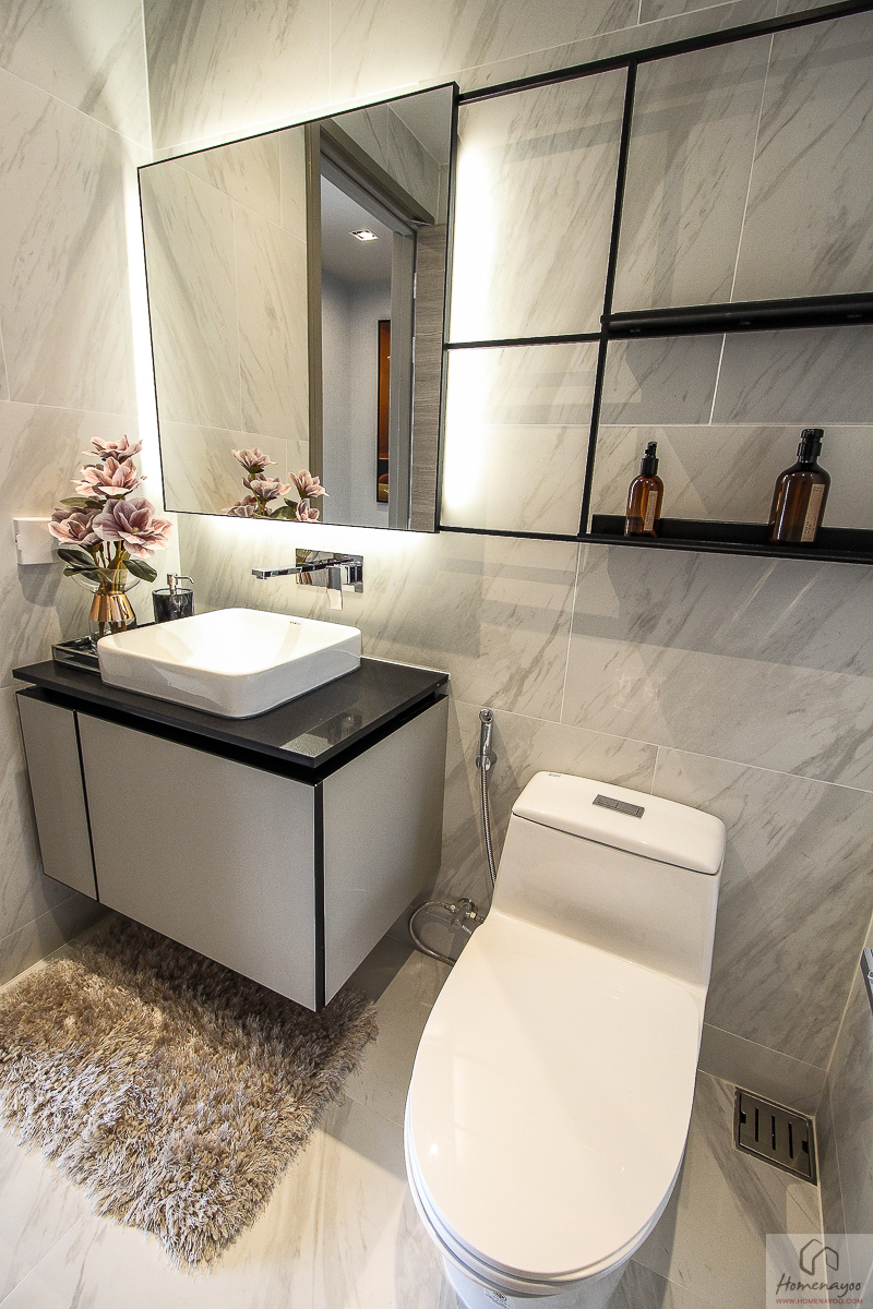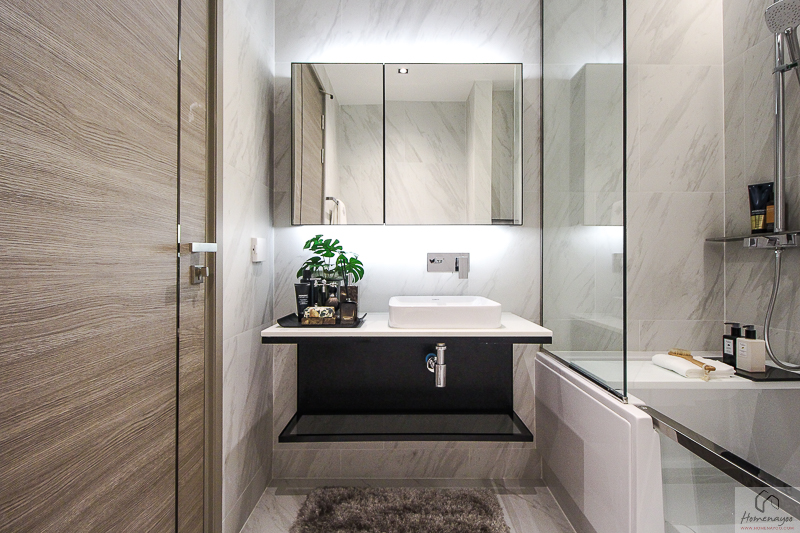 อ่างล้างมือทำเคาน์เตอร์หินควอตซ์ พร้อมชั้นวางของด้านล่างมาให้กว้างขวาง ผนังด้านบนติดตู้เก็บของหน้าบานกระจกเงา ที่เปิดออกมามีชั้นเก็บของของจริงได้ตามนี้ ติดเครื่องทำน้ำร้อนมาให้เรียบร้อย