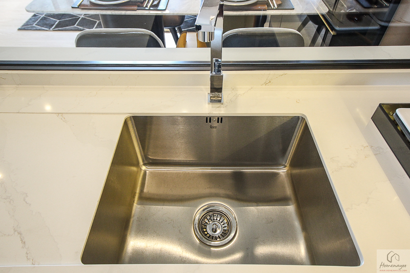 เคาน์เตอร์ครัวฝั่งที่ติดกระจกใสจะเป็นอ่างล้างจาน ทำให้ล้างจานไปดูทีวีไปได้ ส่วนอ่างล้างจานเป็นอ่างสแตนเลสหลุมสี่เหลี่ยม จะเห็นว่าบน Top ครัว ข้างอ่างล้างจานทำพื้นลาดเอียงนิด ๆ ให้ใช้วางพักจานชามที่เพิ่งล้างเสร็จได้ ก๊อกน้ำเป็นโครเมียมหมุนไปมาซ้ายขวาได้ บนเคาน์เตอร์ครัวมีพื้นที่ในการวางของและประกอบอาหารได้ค่อนข้างเยอะค่ะ