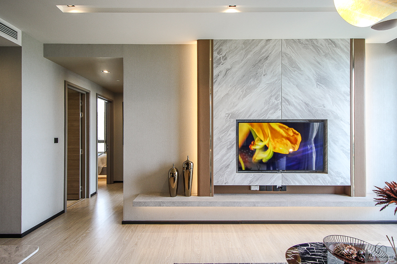 มองไปทางฝั่งชั้นวางทีวี ห้องตัวอย่างทำบิวท์อินชั้นลอย พร้อมกรุผนังมาให้ดูเป็นไอเดีย ของจริงจะเป็นผนังโล่งต่อเติมกันเองตามสไตล์การใช้งานนะคะ