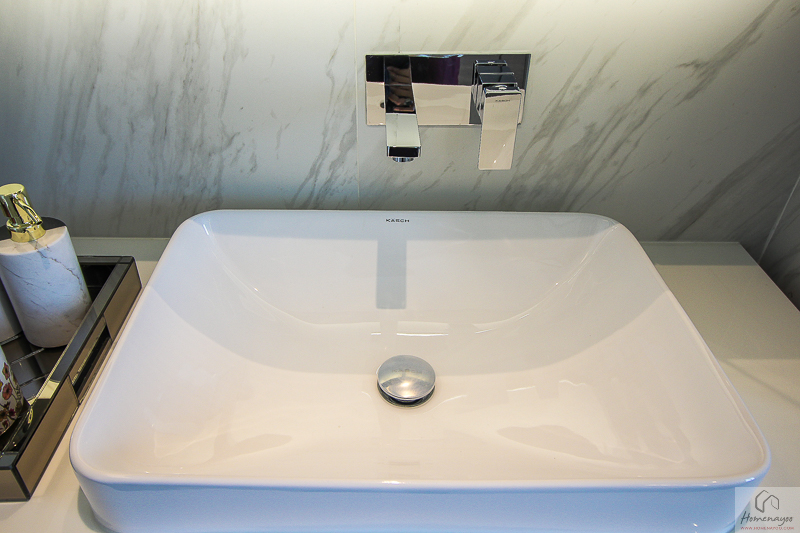อ่างล้างหน้าใช้ของ KASCH พร้อมเคาน์เตอร์ขนาดกว้าง ใช้วางของได้เยอะ ส่วนตัวก๊อกเป็นก๊อกผสมน้ำร้อน-น้ำเย็นแบบฝังผนัง