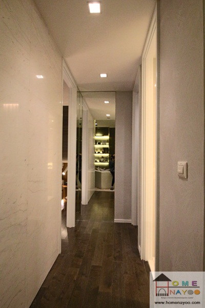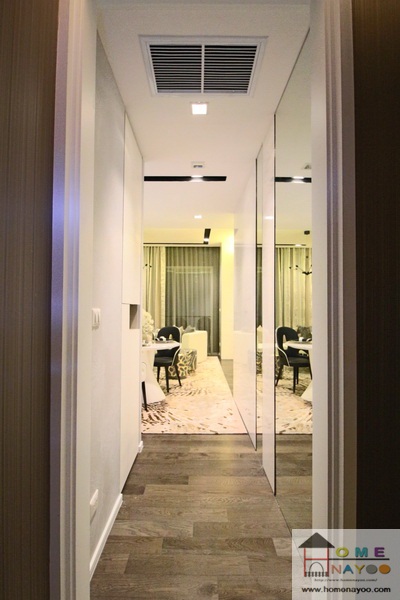 พื้นห้องปู Engineering wood สีเข้ม หน้า 14 มม. เท่ากับแบบ 1 ห้องนอน โดยเข้ามาส่วนแรกจะเป็นโถงทางเดินเล็กสั้นๆ ก่อนที่จะเข้าไปภายในตัวห้องค่ะ