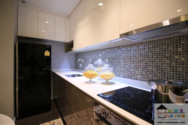 เคาน์เตอร์ครัว TOP หินสังเคราะห์ วัสดุเหมือนกับห้องที่แล้วเกือบทั้งหมด แตกต่างกันที่ขนาดค่ะ โดยห้องนี้จะได้เคาน์เตอร์ขนาดใหญ่กว่า (กว้าง 3.5 เมตร) ส่วนบิวท์อินด้านบน และด้านล่าง จะได้เป็นบานปิด Hi-Gloss
