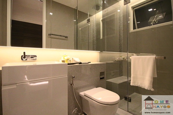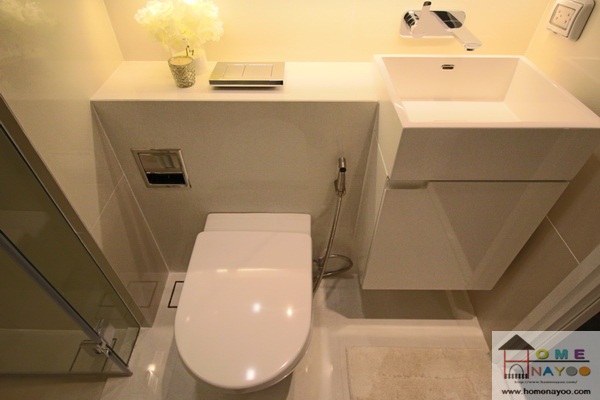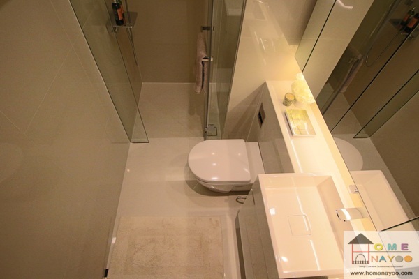 ภาพรวมภายในห้องน้ำ วัสดุและตำแหน่งสุขภัณฑ์เหมือนกันกับแบบ 1 ห้องนอน