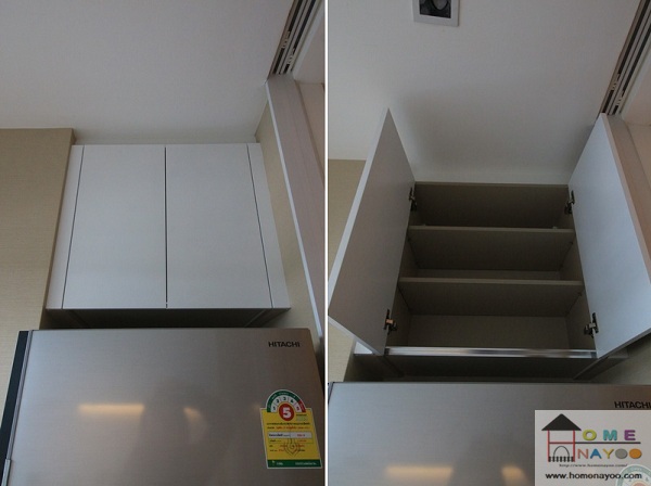 ด้านบนช่องวางตู้เย็น ก็มีการบิวท์อินตู้เก็บของเพิ่มเติมเข้าไปให้อีก เปิดออกให้ดูแบ่งออกเป็นสามชั้นค่ะ
