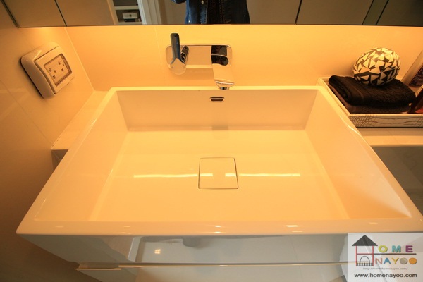 อ่างล้างหน้าทรงสี่เหลี่ยมของ Kasch พร้อมตู้เก็บของด้านล่าง ก็อกน้ำมีระบบน้ำร้อน-เย็น ด้านข้างติดตั้งปลั๊กไฟแบบกันน้ำให้ด้วย
