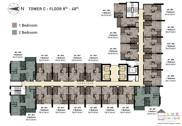 แปลนอาคาร C : ชั้น 8-40 แปลนและห้องพักจะเหมือนกันทั้งหมด โดยจะมีห้องพักทั้งหมด 21 ห้อง ต่อชั้น แบ่งเป็น 1 ห้องนอน 18 ห้อง และแบบ 2 ห้องนอน 3 ห้อง ตำแหน่งอยู่ที่หัวมุมของอาคารทั้ง 3 ด้านค่ะ
