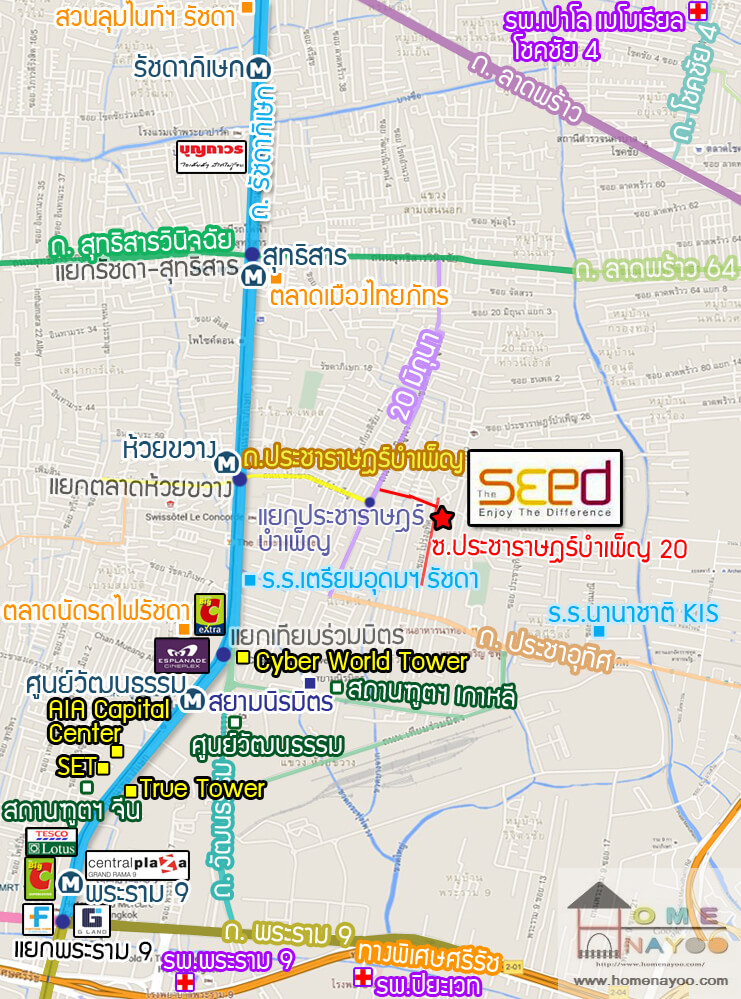 The Seed รัชดา-ห้วยขวาง จาก บมจ.พฤกษา เรียลเอสเตท ตั้งอยู่บนซอยประชาราษฎร์บำเพ็ญ 20 แขวงห้วยขวาง เขตห้วยขวาง กทม. ใกล้รถไฟฟ้า MRT ห้วยขวาง, เซ็นทรัล พระราม 9, ฟอร์จูน พระราม 9, บิ๊กซี เอ็กซ์ตร้า, The Street รัชดา, เอสพลานาด รัชดา และ รพ.พระราม 9