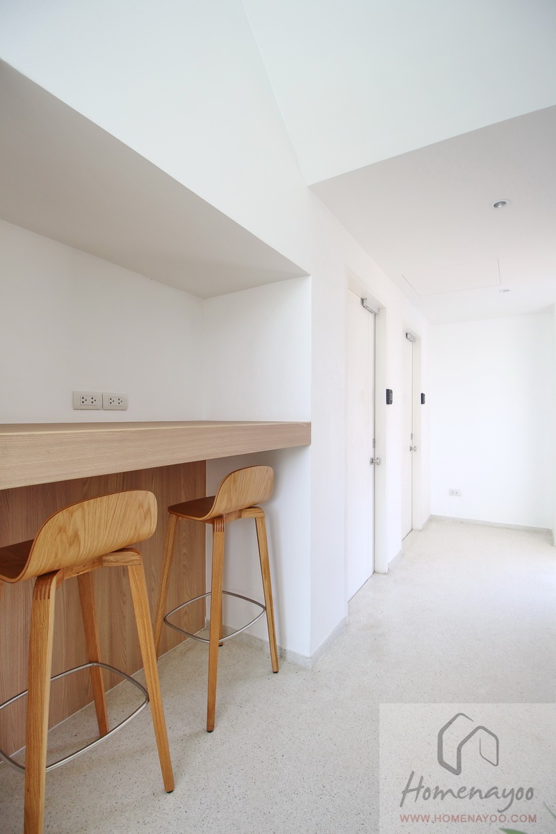 จากหน้าห้องน้ำมองย้อนกลับออกมา ไปต่อกันที่ห้องครัว ตำแหน่งของห้องครัว จะอยู่ติดกับมุมรับประทานอาหาร เพื่อการเคลื่อนย้ายอาหารได้อย่างสะดวกถัดจากมินิบาร์เข้าไปจะเป็นห้องครัว ทางโครงการติดตั้งประตูบานเลื่อนเอาไว้ให้ดูเป็นแนวทาง เดินเข้ามาดูด้านในบิวท์อินเคาน์เตอร์ครัว U-Shape