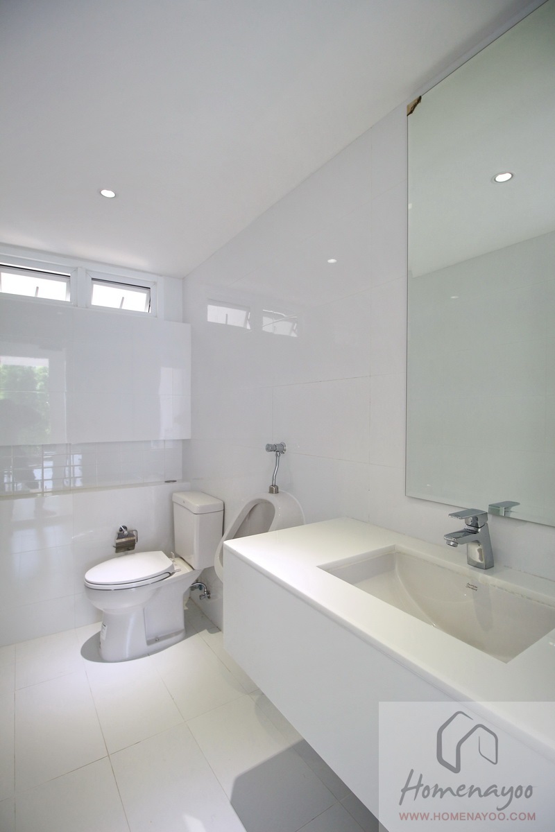 ห้องนี้ผนังปูด้วยกระเบื้องแกรนิตโต้ขนาดเดียวกันแต่เป็นโทนสีเทาอ่อนบางส่วนเป็นกระเบื้องลายไม้เพื่อเพิ่มสีสันให้ห้องน้ำ ภายในมีหน้าต่างกระจกบานกระทุ้งทำให้มีแสงธรรมชาติส่องเข้ามาในห้อง