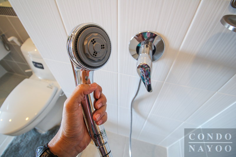ด้านในติดฝักบัวมาให้แบบปรับระดับสูงต่ำได้