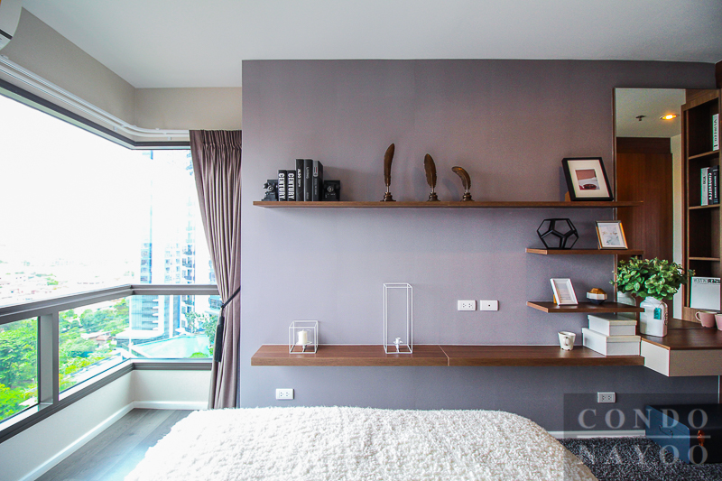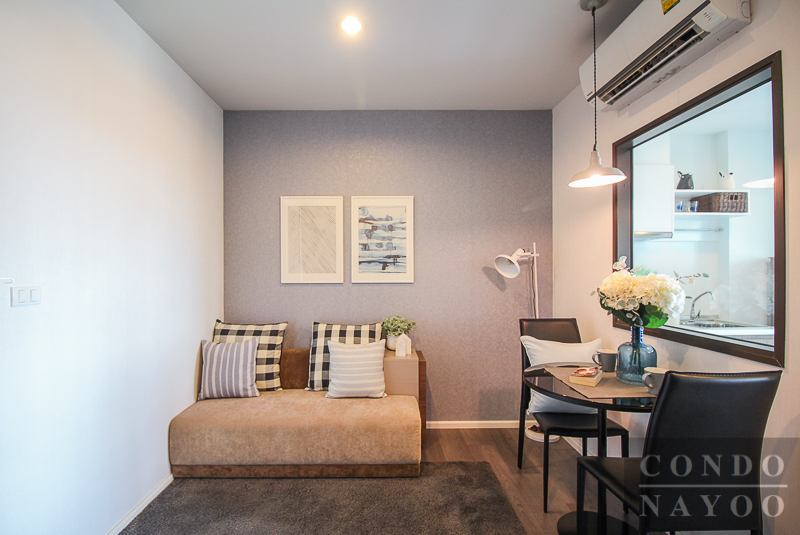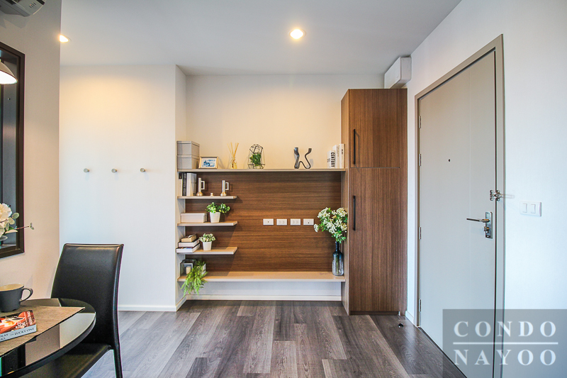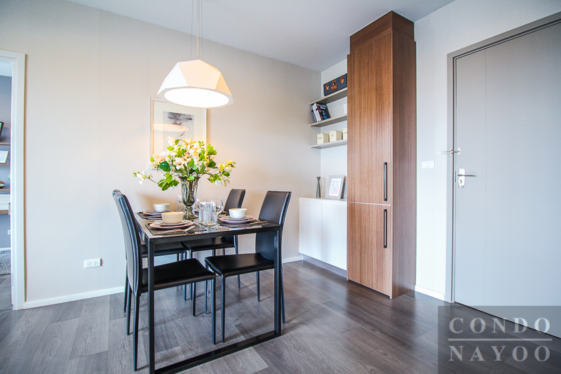 เดินเข้าห้องมาจะเจอส่วนรับประทานอาหารก่อนเลย พื้นที่เปิดโล่งเชื่อมไปยังห้องนั่งเล่น ด้านในสุดเป็นระเบียง ซ้ายมือจะเป็นห้องครัว ห้องน้ำ และห้องนอนเล็ก ขวามือเป็นห้อง Master Bedroom พื้นห้องเป็นไม้ลามิเนตหนา 8 มม. ฝ้าสูง 2.6 ม.
