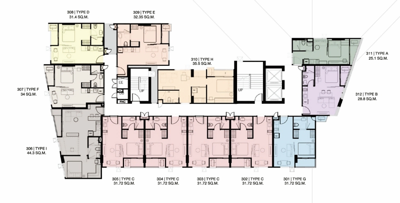 ผังชั้น 2 ของอาคาร ส่วนยูนิตที่พักอาศัยเริ่มที่ชั้นนี้ค่ะ โดยมีความหนาแน่นยูนิตที่ 9 ยูนิตต่อชั้น โดยจะมีประตูพร้อม Access Card ผ่านเข้าออกเพื่อความเป็นส่วนตัวของผู้พักอาศัยในชั้นนี้ค่ะ ความพิเศษของชั้น 2 คือจะมีล็อบบี้ของโครงการอยู่ โดยมีที่นั่งพักผ่อนและล็อกเกอร์สำหรับเก็บของ และมีห้องฟิตเนสอยู่ที่ชั้นนี้ด้วย