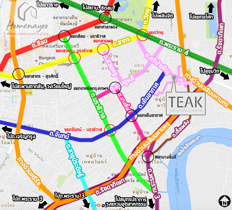 วันนี้เรามีภาพการเดินทางโดยรถมาให้ชมกันก่อน เส้นทางการเดินทางตามลูกศรแดง โดยเริ่มเดินทางจาก ถนนสาทร → แยกสาทร → นราธิวาส → เลี้ยวขวาเข้าถนนนราธิวาส → เลี้ยวซ้ายเข้าถนนจันทน์ → เลี้ยวซ้ายเข้าถนนนางลิ้นจี่ → เลี้ยวขวาเข้าถนนเย็นอากาศ → เลี้ยวขวาเข้าถนนศรีบำเพ็ญ→ ตรงมาประมาณ 280 ม.จะเจอ โครงการ The Teak Sathorn-Lumpini อยู่ทางขวามือแล้วค่า