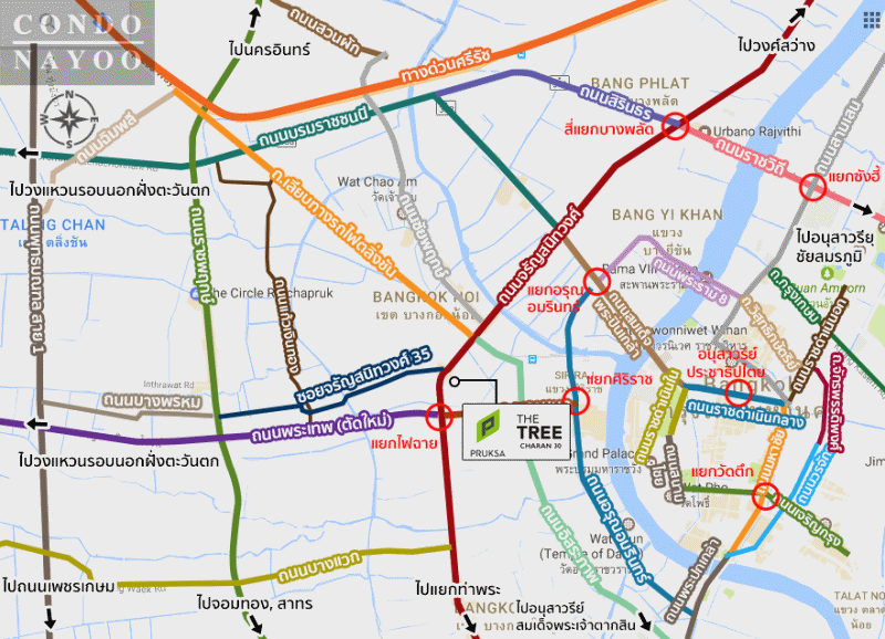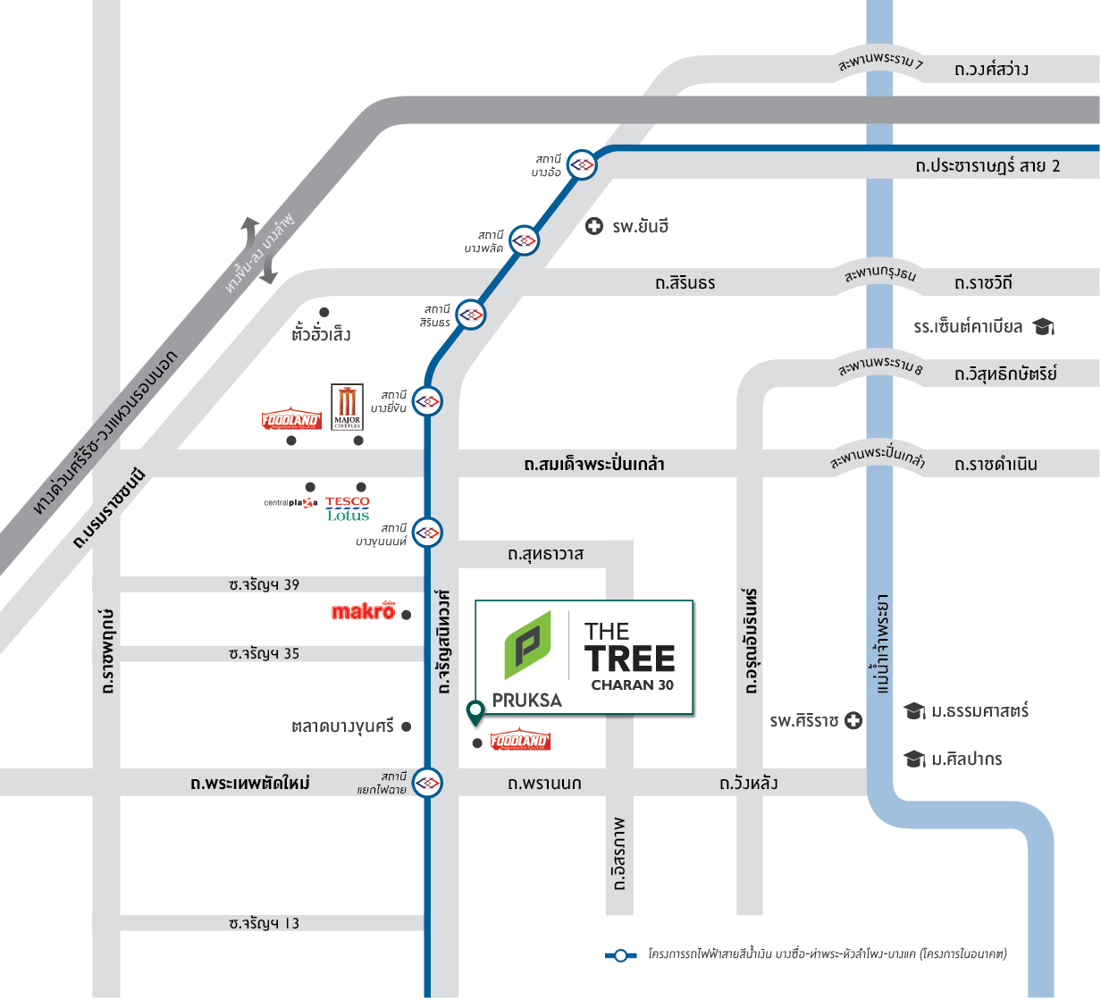 ทำเลที่ตั้งโครงการ : โครงการ The Tree จรัญฯ 30 ตั้งอยู่ติดถนนจรัญสนิทวงศ์ ฝั่งมุ่งหน้าท่าพระ ตรงข้ามตลาดบางขุนศรี ก่อนถึงแยกไฟฉาย บรรยากาศโดยรวมค่อนข้างคึกคัก แต่ภูมิทัศน์และการจราจรปัจจุบันอาจจะมีติดขัดบ้างเพราะกำลังมีการก่อสร้างรถไฟฟ้าสายสีน้ำเงินกันอยู่