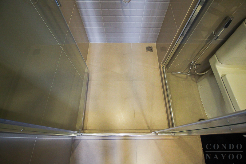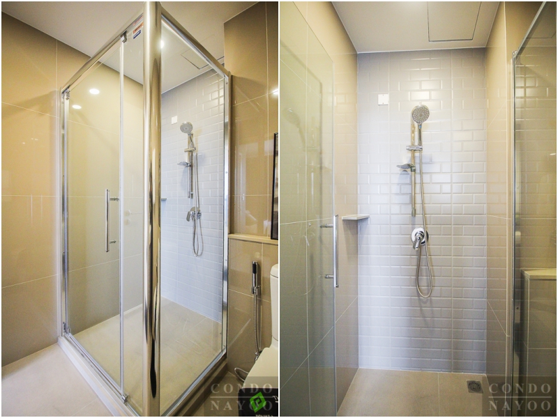 พื้นที่ห้องอาบน้ำมี Shower Box ติดตั้งมาให้ บานประตูแบบผลัก