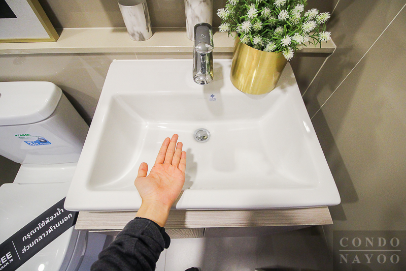 ตัวอ่างล้างมือได้เป็นอ่างพร้อมเคาน์เตอร์เก็บของใต้อ่าง ขนาดใหญ่กว่าที่ห้องนั่งเล่น ติดตั้งมาให้พร้อมกระจกเงาบานสูง