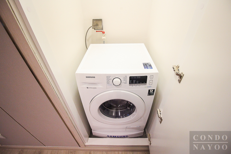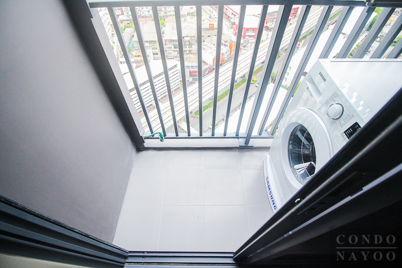 พื้นที่ระเบียงสามารถติดตั้งเครื่องซักผ้าตามแบบห้องตัวอย่างได้ หลังวางเครื่องซักผ้าลงไปแล้วจะเหลือพื้นที่พอให้ออกมายืนเก็บผ้าจากเครื่องซักผ้าได้หรือจะวางราวตากผ้าเล็กๆก็พอได้อยู่ค่ะ