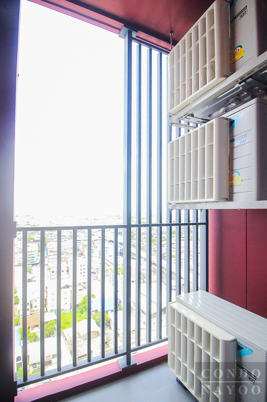 พื้นที่ระเบียงภายนอกจะมีราวกันตกเป็นเหล็กซี่สีดำ พร้อมตกแต่งกริลล์เพิ่ม เพื่อบังสายตาจากคอมเพรสเซอร์แอร์ด้วย