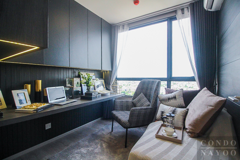 เข้ามาภายในห้อง ทางโครงการจัดมาให้ดูเป็นห้องทำงาน เหมาะสำหรับคนที่อยู่คนเดียว ไลฟ์สไตล์ทำงานที่บ้าน หรือชอบขนงานกลับมาทำที่บ้านบ่อยๆค่ะ โดยห้องนี้จะมีช่องแสงบานใหญ่ 1 บาน ช่วยให้ห้องดูโปร่งขึ้น ส่วนใครที่จะจัดเป็นห้องนอน ห้องนี้วางเตียงขนาด 3.5 ฟุต กำลังดีค่ะ