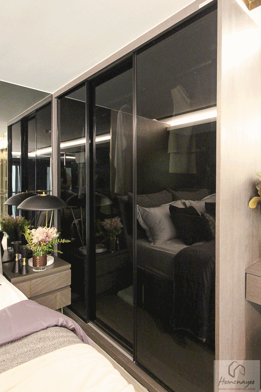 ตู้เสื้อผ้าที่ทางโครงการมีให้ขนาดจะเท่ากับห้องตัวอย่าง ด้านในแบ่งพื้นที่และมีลิ้นชักสำหรับเก็บของให้เป็นสัดส่วน แต่หน้าบานตู้จริงที่ได้จะเป็นลามิเนตและอีกด้านเป็นกระจกเงาซึ่งทำให้สะดวกในการแต่งตัว