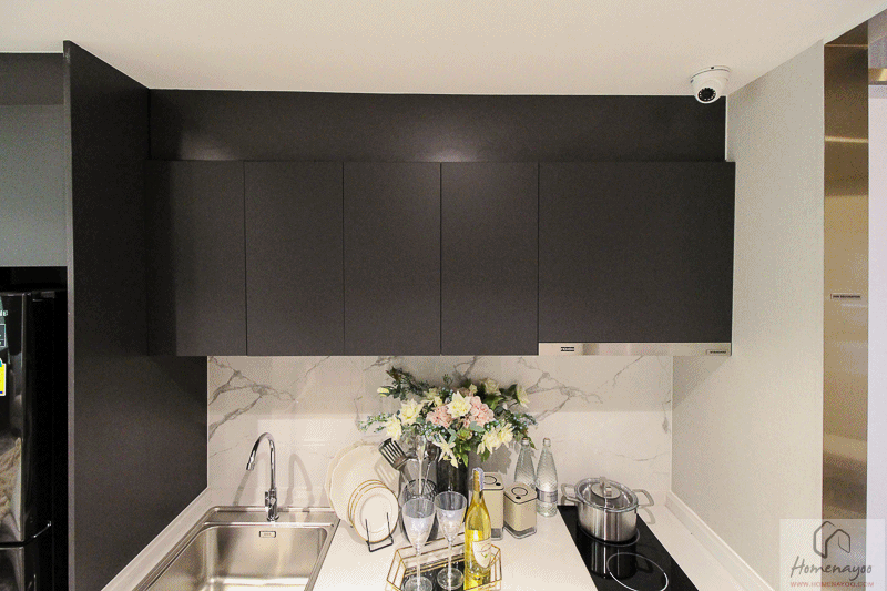 เคาน์เตอร์ครัวใหญ่ โครงการมีให้ตามนี้พร้อมเตาไฟฟ้า, เครื่องดูดควันและอ่างล้างจาน ด้านบนและด้านล่างก็ติดตั้งตู้/ชั้นวางของ ทำให้ตรงนี้เก็บของได้เยอะ โดยหน้าบานตู้จะเป็น UV Coated Panel โทนสีเทา ด้านข้างมีพื้นที่ว่างเว้นไว้สำหรับวางตู้เย็นใบใหญ่