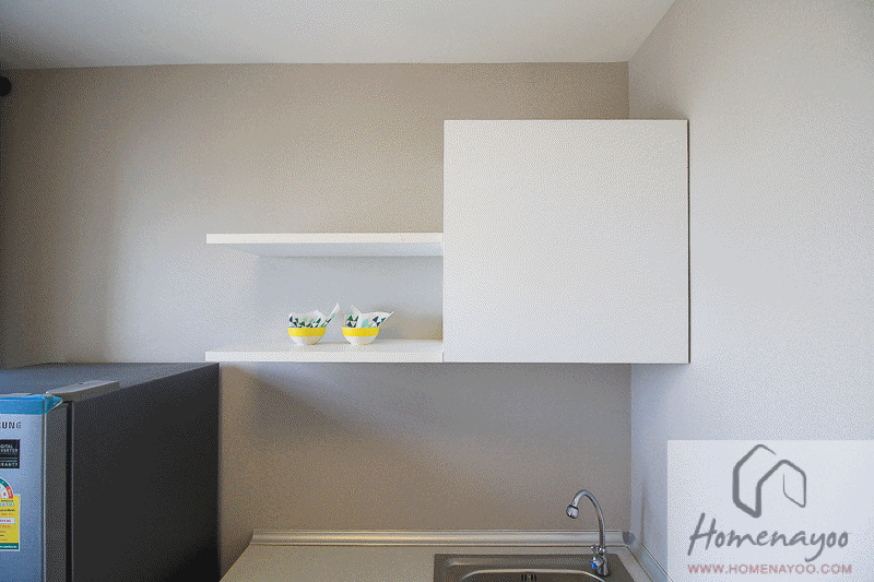 เข้ามาดูพื้นที่ส่วนครัวกันก่อน โดยชุดครัวที่ได้จะเหมือนกันห้องแบบที่แล้ว เป็นชุดครัวมาตรฐาน