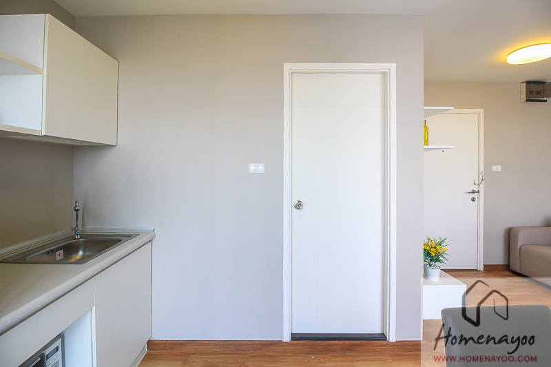 เข้ามาภายในห้องครัวจะเห็นชุดครัวและชุดโต๊ะทานอาหารติดตั้งมาให้ครบชุด ส่วนแสงธรรมชาติภายในห้องนี้ก็จะมาจากประตูบานเลื่อนที่เชื่อมกับระเบียงภายนอก