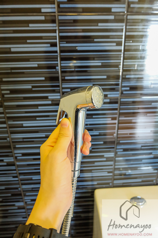 ภายในห้องอาบน้ำ ติดตั้งฝักบัวแบบ Hand Shower มาให้ พร้อมถาดวางสบู่ ตัวฝักบัวขนาดพอดีๆ