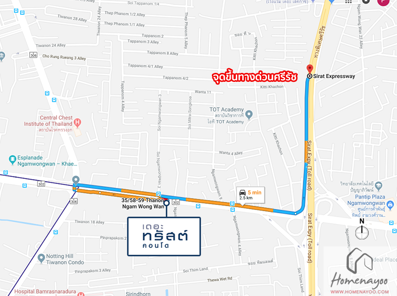 จุดขึ้นทางด่วนศรีรัชที่ใกล้โครงการที่สุด จะเป็นจุดขึ้นทางด่วนศรีรัช ฝั่งขาออก มีระยะทางจากโครงการประมาณ 2.5 กม. ใช้เวลาเดินทางประมาณ 5 – 15 นาทีค่ะ