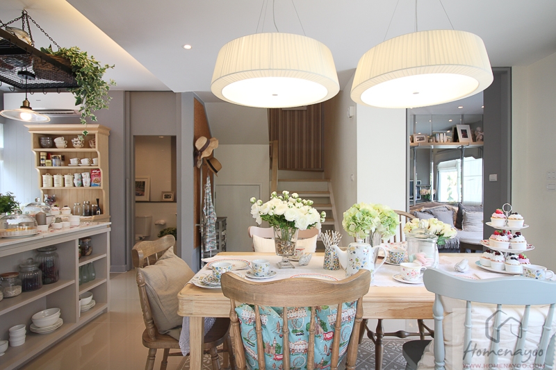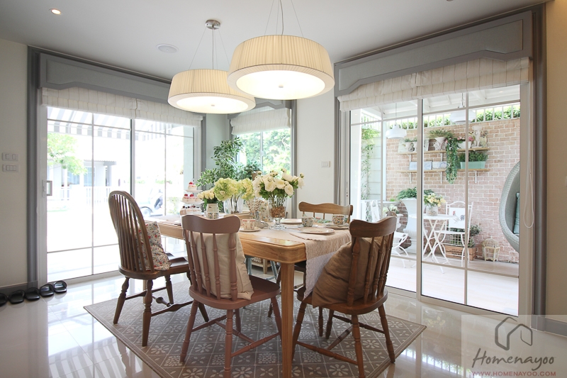 ภาพจากทางบ้านมาตรฐาน บริเวณโถงอาจจะไม่กว้างขวางมากแต่ด้วยฝ้าเพดานที่สูงโปร่งจึงทำให้ดูไม่มืดทึบค่ะ บริเวณตรงกลางฝ้าเพดานจะติดดวงโคมซาลาเปามาให้ 1 ดวง
