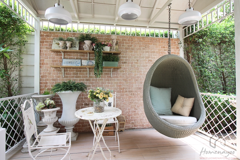 ไอเดียตกแต่งพื้นที่ลานซักล้างหลังบ้านโดยการติดตั้งระแนงไม้และแขวนไม้ประดับ ตรงนี้จะช่วยสร้างร่มเงาและลดปริมาณของแสงแดดที่จะสะท้อนเข้าไปภายในตัวบ้านได้เป็นอย่างดี
