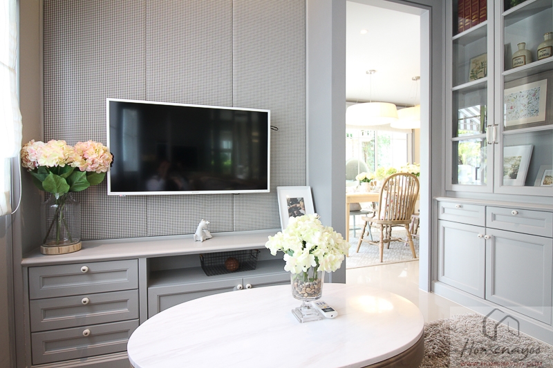 มองไปอีกฝั่งนึงจะเป็นผนัง Built – in ของโต๊ะเครื่องแป้ง เราสามารถจัดให้เป็นชั้นวางทีวีได้พอดี