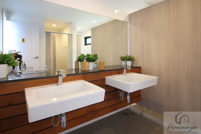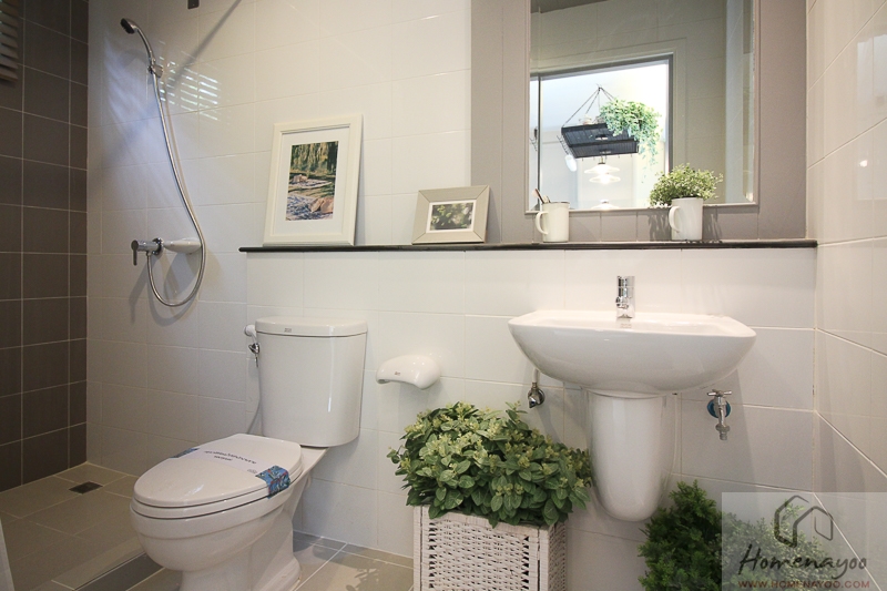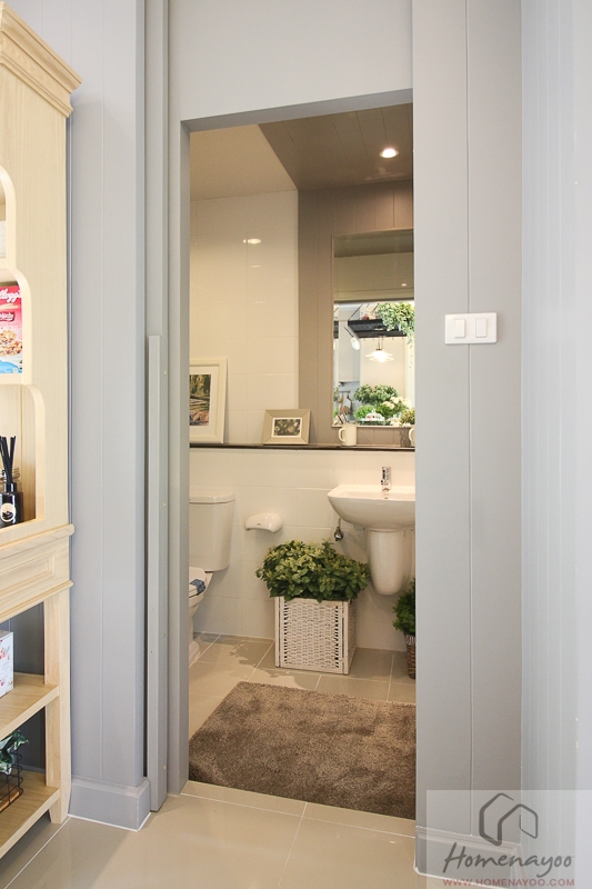 ภายในห้องน้ำ 1 การจัดวางห้องน้ำจะเหมือนห้องน้ำชั้นล่างทุกประการเลยค่ะ ทั้งวัสดุและสุขภัณฑ์ก็จะใช้แบบเดียวกัน ด้านหลังอ่างล้างหน้ามีการทำ Lower wall ช่วยเพิ่มพื้นที่ในการวางของใช้ภายในห้องน้ำได้เป็นอย่างดี