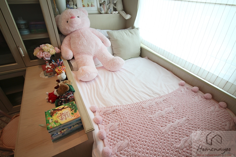 หลังโต๊ะทำงานวางที่นอนขนาด 3 ฟุตครึ่ง การวางเตียงด้านในแบบนี้อาจจะทำให้เปลี่ยนผ้าปูที่นอนค่อนข้างยากหน่อย แต่ถ้าฟูกไม่หนักมากก็ไม่ค่อยเป็นปัญหามาก