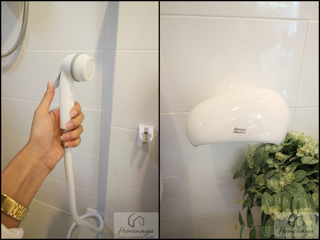 สายฉีดชำระพลาสติกขนาดพอดีมือ และที่ใส่กระดาษชำระเซรามิก