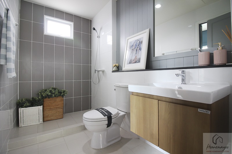 ภายในห้องน้ำมีการวางแปลนไล่จากส่วนแห้งเข้าไปยังส่วนเปียก พื้นและผนังตกแต่งด้วยกระเบื้องเซรามิกขนาด 30 x 30 ซม. ส่วนสุขภัณฑ์ภายในห้องน้ำจะใช้ของ American Standard ทั้งหมด