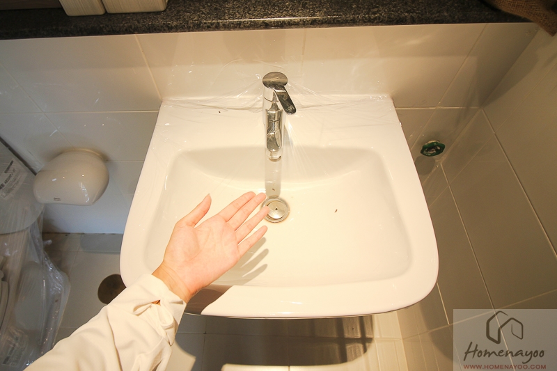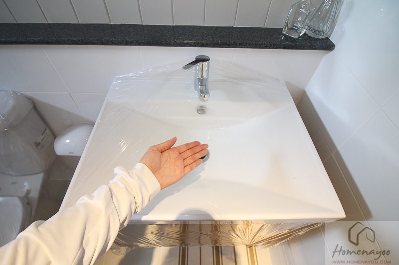 มาดูที่สุขภัณฑ์กันค่ะ อ่างล้างหน้าที่ได้จะเป็นแบบแขวนผนัง มีขนาดกระทัดรัดทรงมนปลอดภัยในการใช้งาน มีพื้นที่ขอบอ่างให้วางขวดสบู่ได้นิดหน่อย ด้านหลังอ่างก่อเป็น Lower wall สามารถใช้วางของได้สะดวกกว่าค่ะ