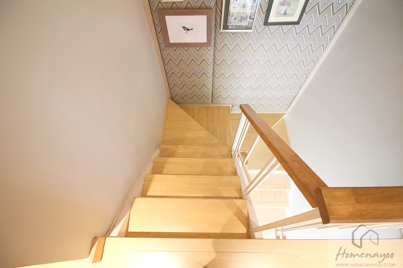 เราเสร็จจากชั้นที่ 1 กันแล้วนะคะ ไปดูที่ชั้น 2 กันต่อเลย บันไดจะเป็นบันไดโครงเหล็กโปร่ง วัสดุลูกนอนเป็นไม้สำเร็จรูป ส่วนราวบันไดจะเป็นระแนงเหล็กยึดกับแม่บันได วัสดุของมือจับสีเข้ากันกับตัวบันไดค่ะ