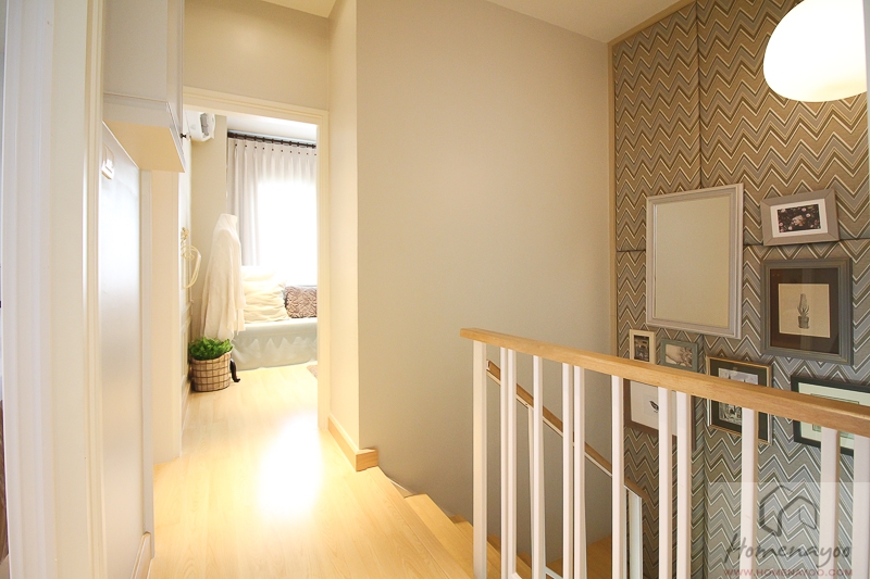 มองย้อนกลับไปที่โถงบันได อาจจะไม่กว้างขวางมากแต่ด้วยฝ้าเพดานที่สูงโปร่งจึงทำให้ดูไม่มืดทึบค่ะ บริเวณตรงกลางฝ้าเพดานจะติดดวงโคมซาลาเปามาให้ 1 ดวง