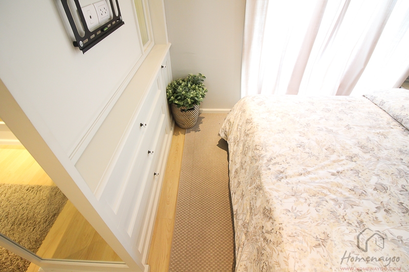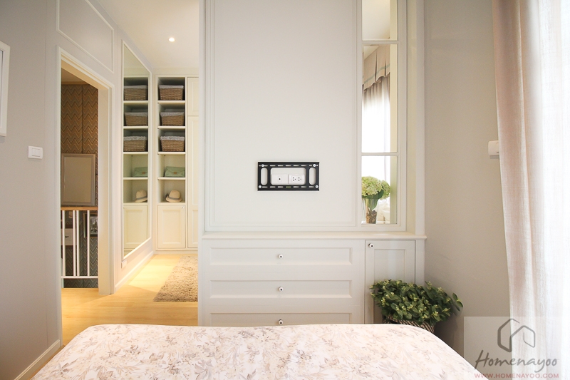 มองไปอีกฝั่งนึงจะเป็นผนัง Built – in ของโต๊ะเครื่องแป้ง เราสามารถจัดให้เป็นชั้นวางทีวีได้พอดี