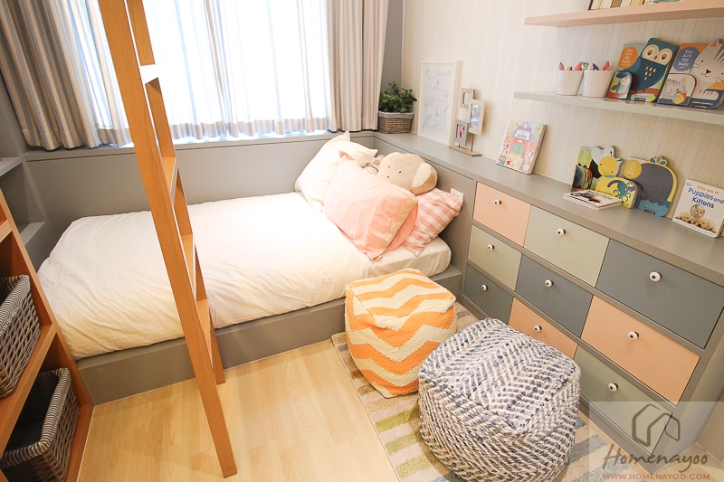 เข้ามาภายในห้องนอน 2 มีขนาดเล็กลงมาจากห้องนอน Master bedroom ประมาณครึ่งนึง ภายในได้จัดวางเฟอร์นิเจอร์มาให้ดูระยะการใช้งาน โดยสามารถจัดเป็นห้องนอนของเด็ก 2 คนได้โดยใช้ความสูงของฝ้าเพดานให้เป็นประโยชน์ โดยการทำเตียงนอนอีกที่อยู่บนตู้เก็บเสื้อผ้าค่ะ