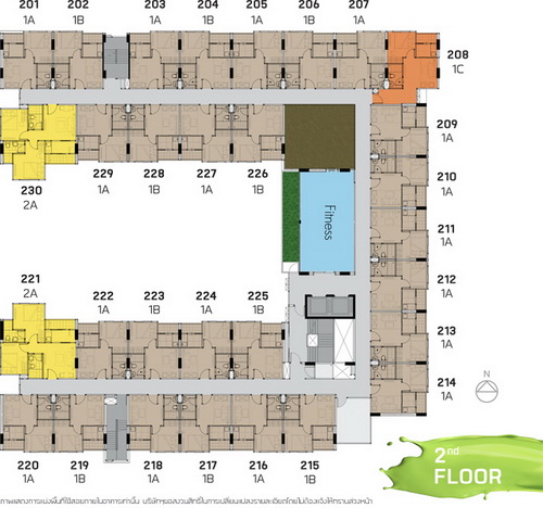 แปลนอาคาร ชั้น 2 : จะเริ่มเป็นส่วนของห้องพัก แต่ก็ยังมี Facilities อยู่ที่ชั้นนี้ คือ ฟิตเนส ที่ตั้งอยู่ตรงกลางของอาคาร สามารถ Take View สวนด้านหน้าของฟิตเนส และสระว่ายน้ำที่อยู่ชั้นล่างได้ด้วย และในส่วนของลิฟท์โดยสาร มีให้ 2 ตัว จะตั้งอยู่ด้านข้างกับฟิตเนสค่ะ