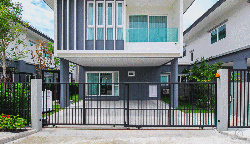 ภายนอกบ้านตกแต่งมาในสไตล์ Modern มีลูกเล่นที่ facade สีภายนอกใช้โทนสีเทาและขาว ได้ประตูรั้วเหล็กสีดำแบบเลื่อนอัตโนมัติ มีประตูแยกสำหรับคนเดิน มีช่องทิ้งขยะ บ้านเลขที่และ Mail Box พร้อมกริ่งด้านหน้า