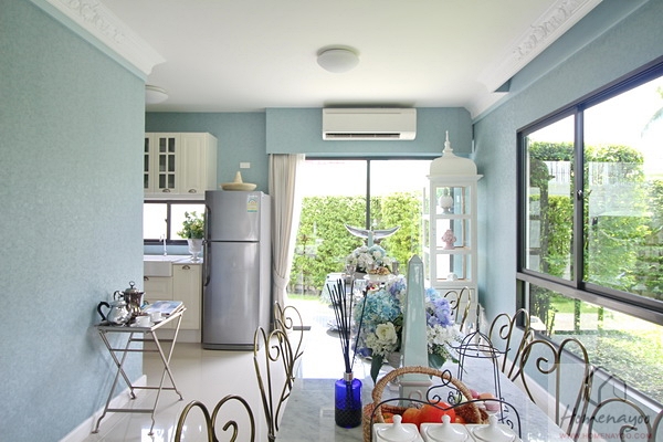 ถัดจากส่วนนั่งเล่นนั้นเป็นโต๊ะทานอาหารค่ะ ด้านซ้ายมือจะเป็นห้องน้ำและครัว ประตูที่เห็นคือประตูทางไปหลังบ้านค่ะ ตรงนี้จะเห็นว่าบ้านแปลงมุมจะได้หน้าต่างด้านข้างซึ่งจะเห็นวิวสวนด้านนอกบ้าน
