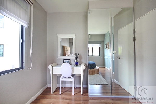 อีกด้านจะเป็นมุมโต๊ะเครื่องแป้งและตู้เสื้อผ้า ถ้าใครเสื้อผ้าเยอะก็วางตู้ใหญ่ตลอดแนวผนังได้เลยค่ะ