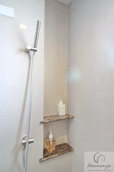 ฝักบัวและที่วางของด้านข้างจะเจาะไปในผนังมีที่ให้วางของได้ค่ะ