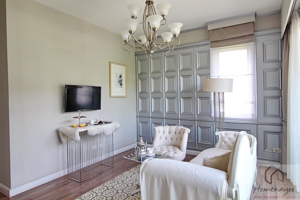มุมนี้เป็นนมุมโต๊ะและตู้ค่ะ พื้นที่เหลือพอสมควรทำให้วางตู้เสื้อผ้าโต๊ะทำงานและโต๊ะเครื่องแป้งได้ หรือถ้าใครเสื้อผ้าเยอะก็วางตู้ใบนใหญ่ไปเลยก็ได้