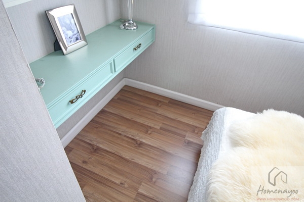 ปลายเตียงมีพื้นที่ลึกลงไปเล็กน้อย สามารถวางเป็นชั้นวางทีวีหรือทำเป็นโต๊ะเครื่องแป้งได้ค่ะ